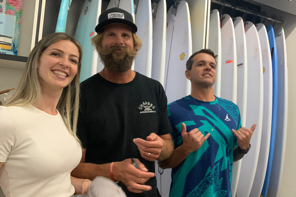 Rodrigo e o sócio investidor Christian Juchem - à dir. - acompanharam Britt Merrick - centro - na visita à fábrica da SRS Surfboards.