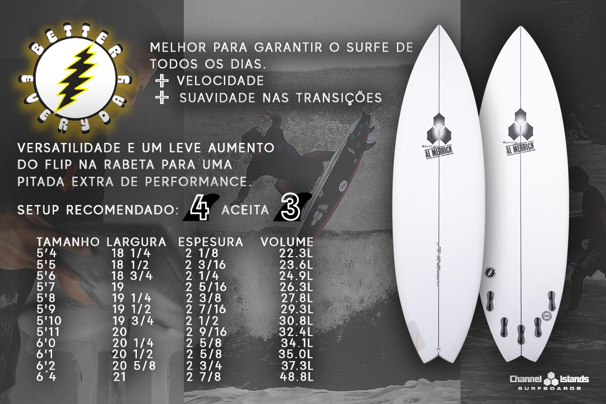 Mantendo as características que fazem da HE uma ótima prancha stepdown de performance, no caso da Better Everyday, a assinatura do falso wing ou hip na rabeta foi suavizada, ganhando cadência na linha de surf, na transição da cavada para o lip da onda, para permitir o surfe em ondas um pouco maiores.