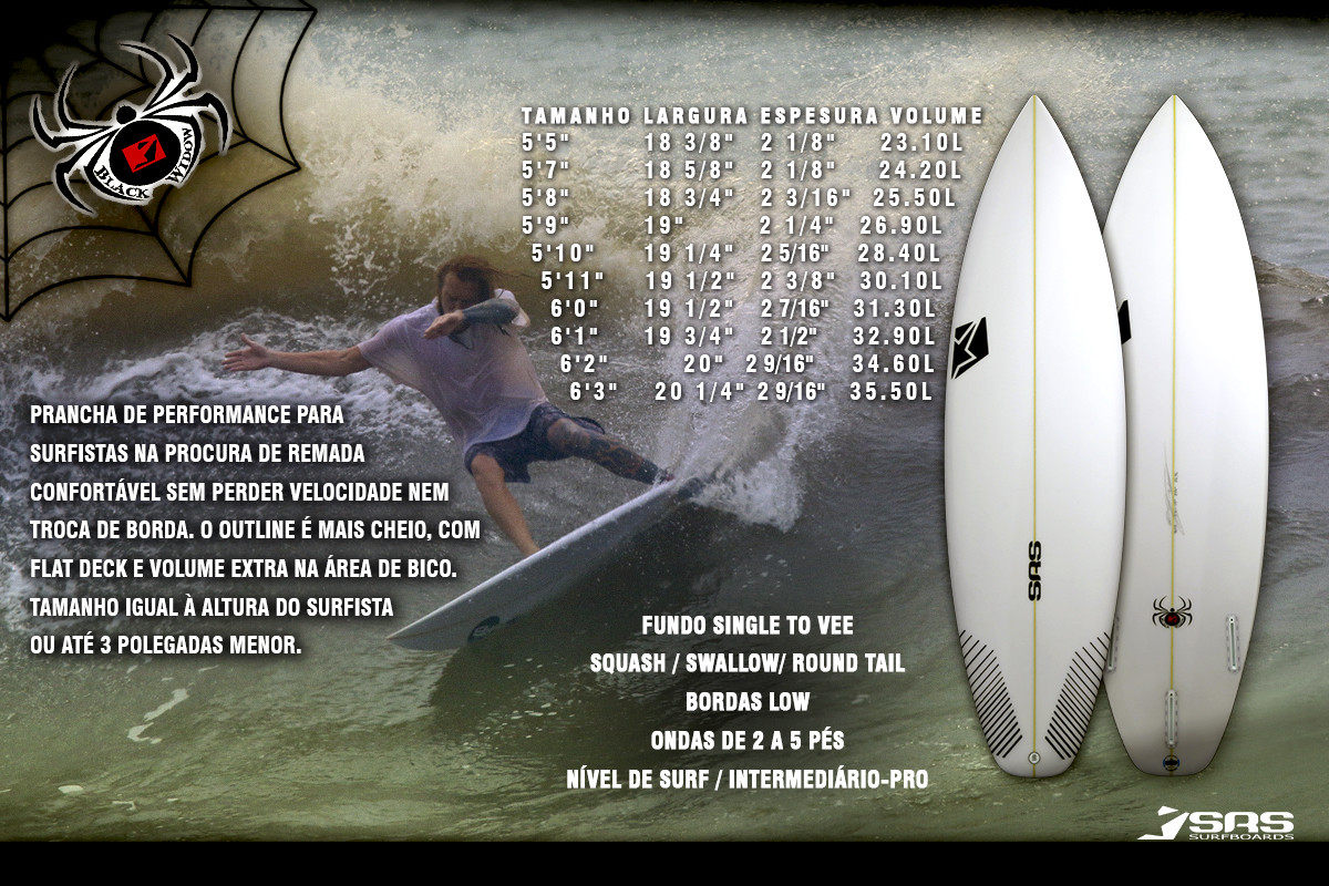O modelo Black Widow possui bordas baixas, fundo single concave e um flat deck com maior área de bico para uma remada confortável. Ela funciona em ondas pequenas até médias e o tamanho recomendado é da mesma altura do surfista ou até três polegadas menor.